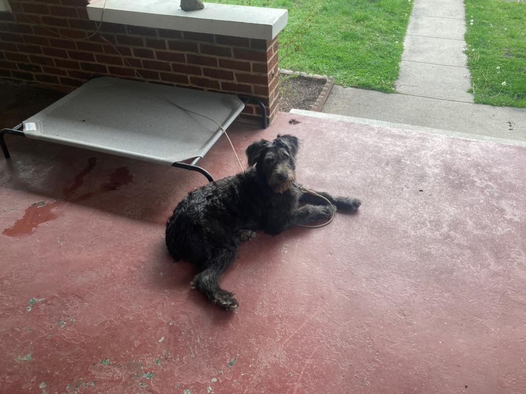 Medium gray and black schnauzer mix. Proof of ownership required. She is safe, fed, and sheltered at the time being