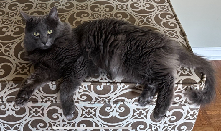 Long haired gray cat. Likely will be a bit skittish. His name is Clyde but he doesn’t know it very well, so may not answer to it.