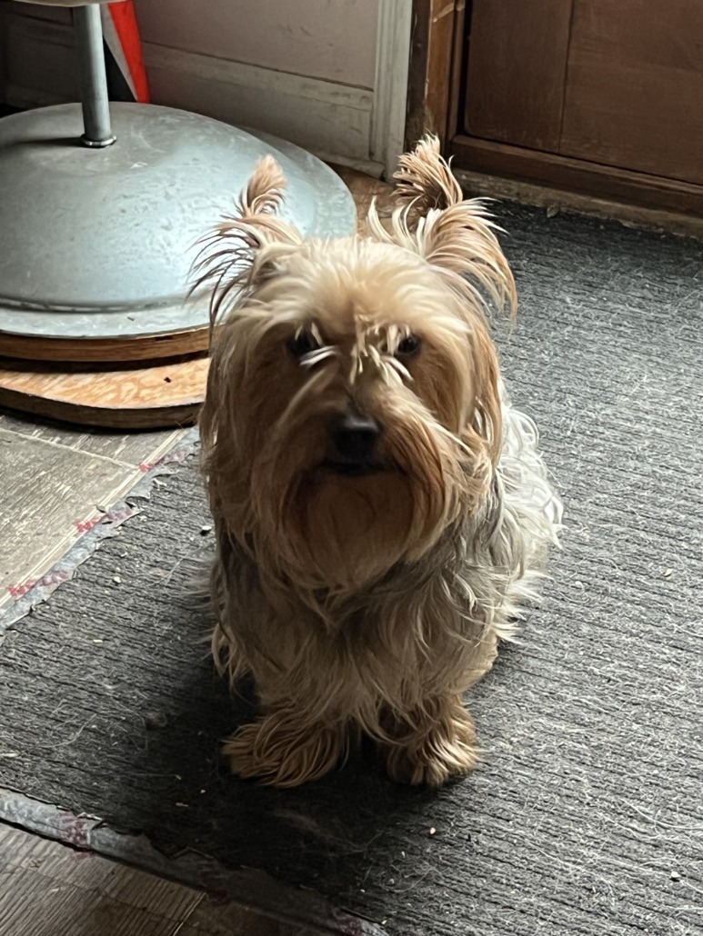Curly haired yorkie. Mostly grey with some gold details around ears and face.