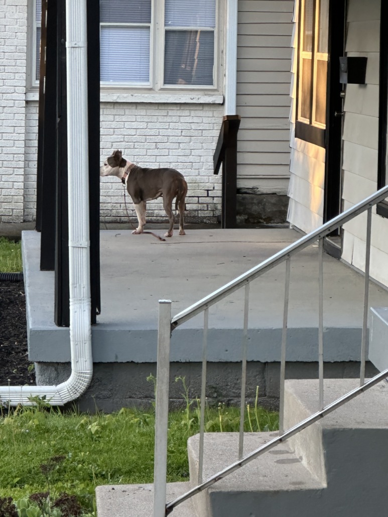 Found a stray white and grey pit mix walking around this morning. Seems sweet and has a collar and leash., but no tags. My dogs won’t let me get close to her, but if anyone knows whose dog this might be please reach out. It is very cold right now and she is shivering.