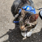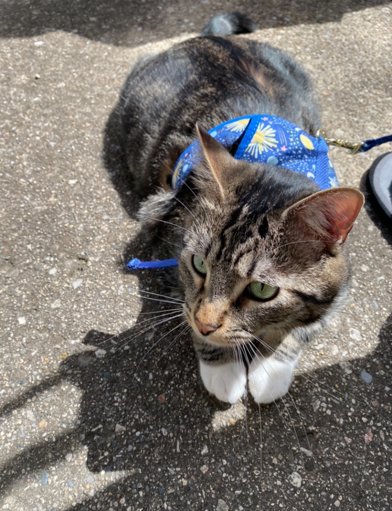 2 years old, gray tabby, white paws, white belly, has dark spot on left hind foot