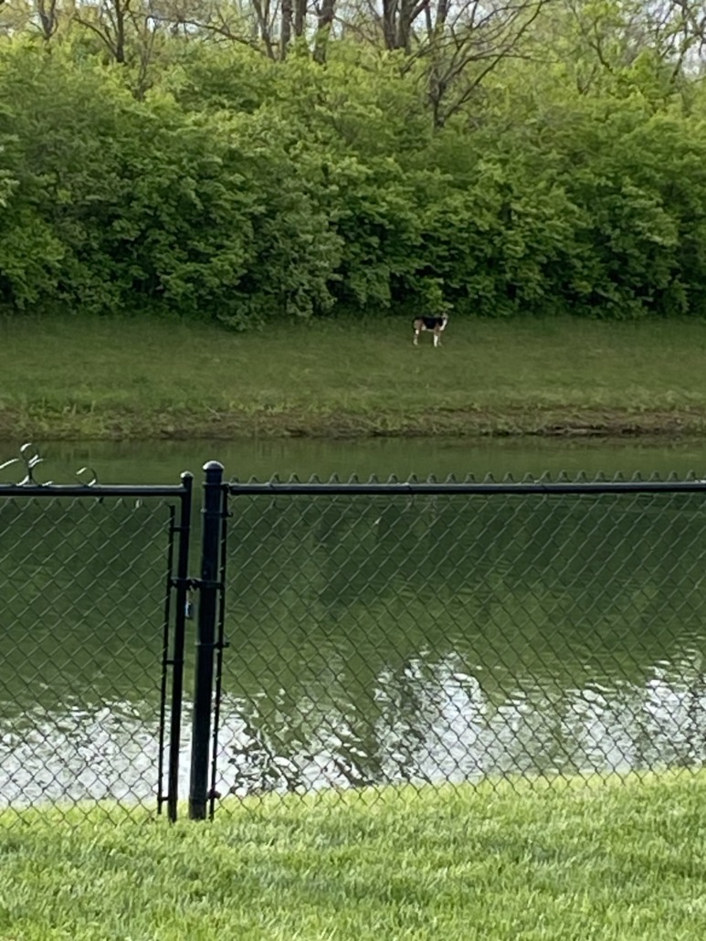 Not a great pic but this pup was seen @10am and then again approx 3:45pm on this side of the pond. This is on Haywood Rd in Center Grove. He/she headed NW.