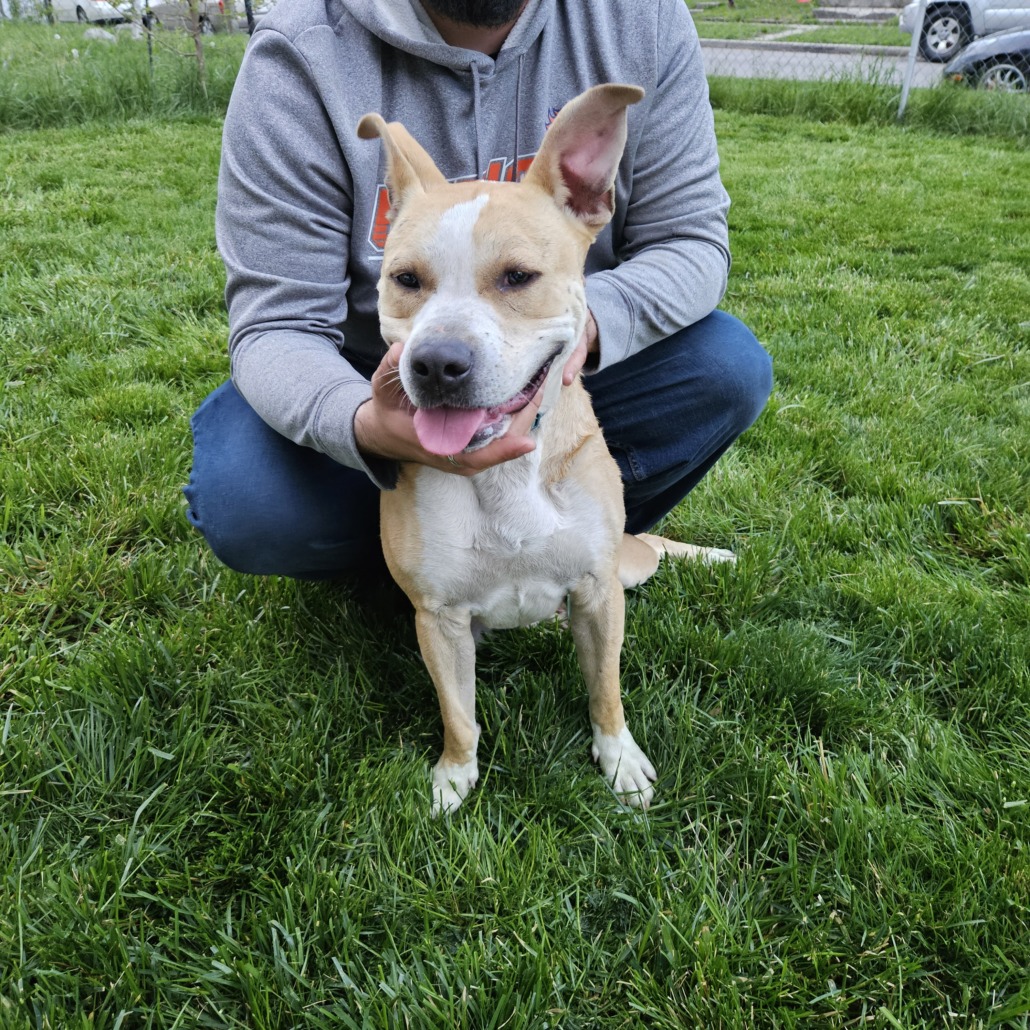 Tan and white. Fixed male dog. Green collar. No tags. Very friendly. Knows some commands. Plays fetch. Good with other dogs.