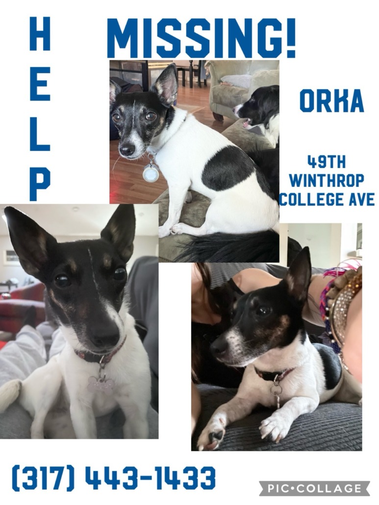 Orka is a small 7lb rat terrier. Please call us if you find our baby! 3179319698 3179101307