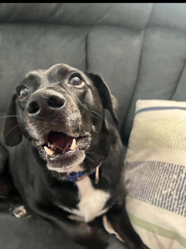 Black lab mix with white chest. A little chunky.