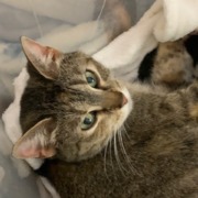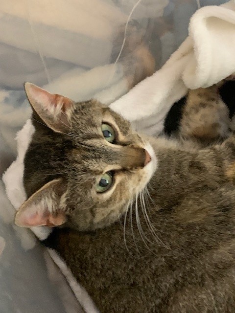 Tabby cat with green eyes that had just given birth to 4 kittens