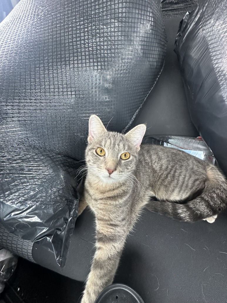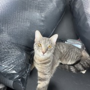Found her at 2am while taking my dog out. She’s a small, grey female kitten with amber eyes, probably 9 months old. Found her with no collar. Looks like someone might have been taking care of her because she doesn’t look malnourished and she’s very comfortable around people. If this is your kitten, please call and have proof of ownership.