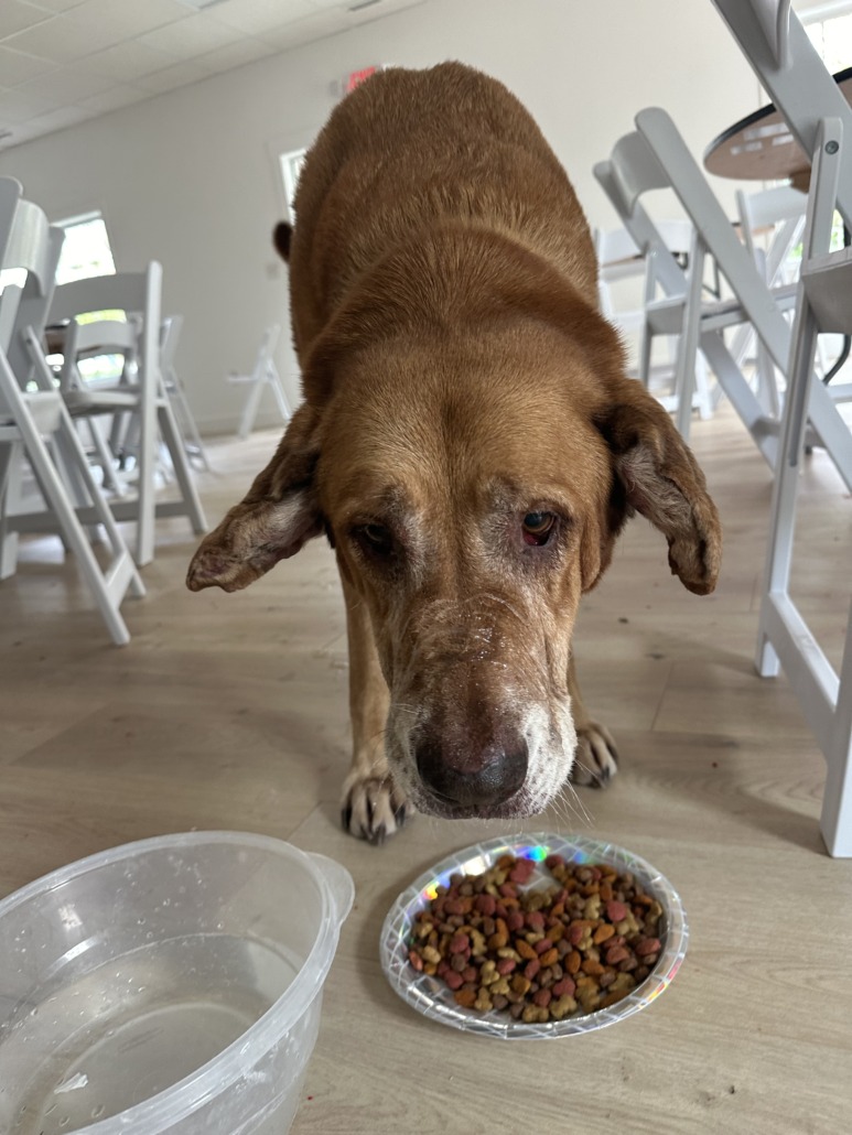 Older male dog found near the pub in new Palestine. Wearing a collar, no tags. Unsure if he has a chip— haven’t been able to check. Super friendly. Exhausted