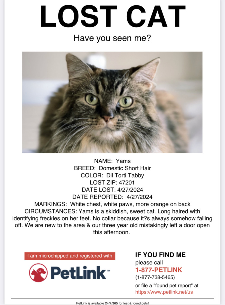 Lost Cat, Alert #71511 Yams missing near US 31 and W Northgate Dr, Columbus47201