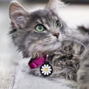 Small female domestic long hair cat. Around 1 year in age. She is wearing a pink collar with a flower tag with her name and our phone number.