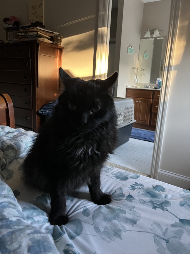 Black long haired cat with white markings on chest and lower belly. Very friendly.