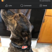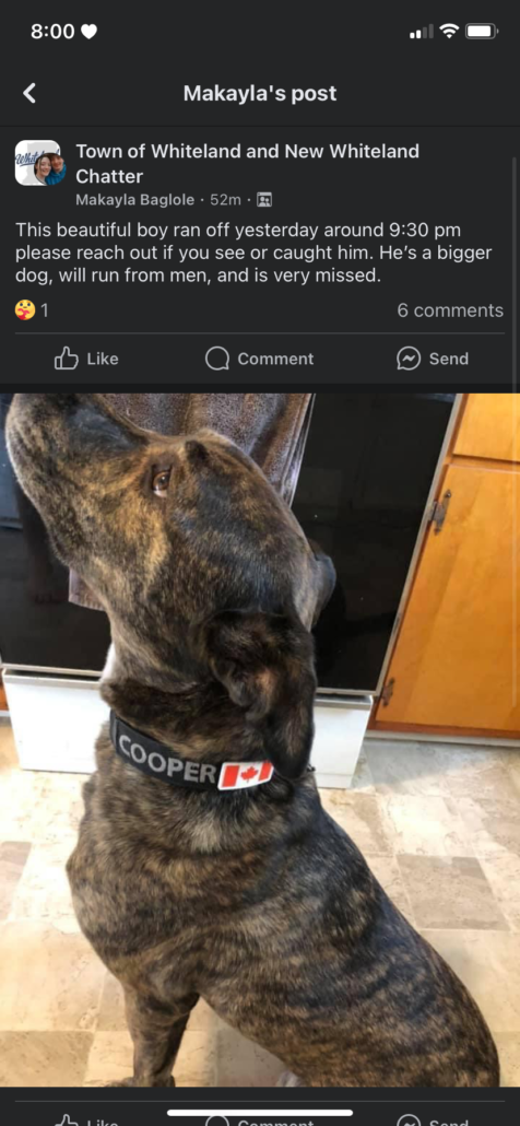 Brindle males dog cooper collar with Canadian flag. 60-65 lbs larger dog. Been out all night possibly running.