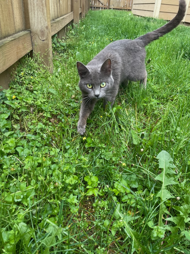Found a small gray cat behind my shed on Saturday but it was skittish; didn’t see it again after the rain. Cat is back today hanging out in my backyard.