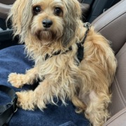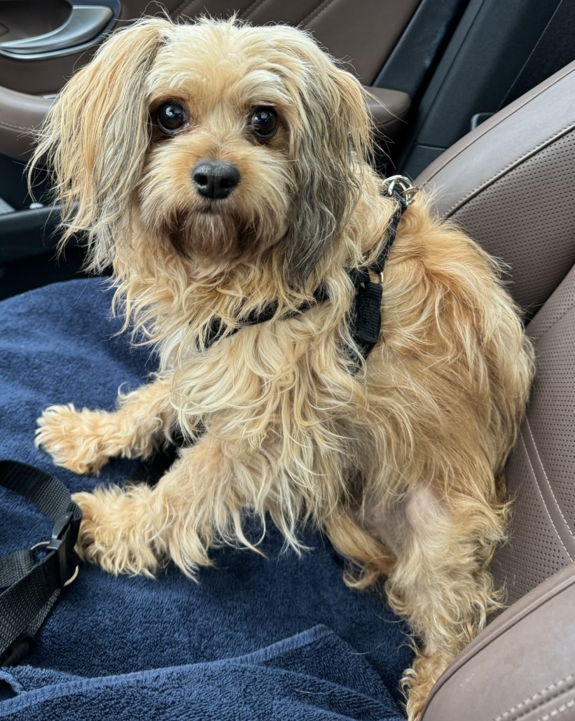 Small dog mix, race with long, shaggy brown hair, black harness, and black leash.