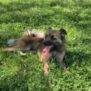 Pup is a small, well-groomed terrier type dog of some kind. Long hair, bridled (black, dark brown, tan). Proof of ownership required.