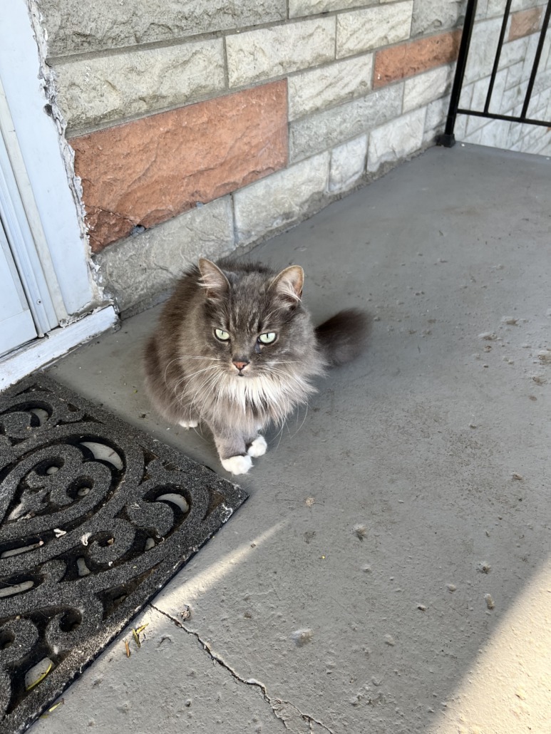 He is grey with white paws. Really fluffy and beautiful green eyes. He is microchipped, but I don’t think I have access to the information anymore. He is really sweet but was an indoor cat for most of his life so he is skittish outside.