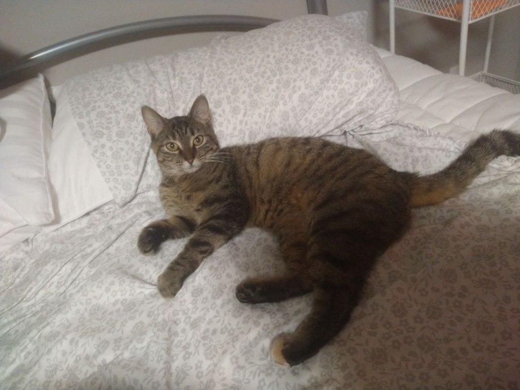 Female domestic shorthair, brown mackerel tabby with brown field. About 1 year old and 7 lbs. Very friendly and sweet. Has a microchip, but we couldn’t contact the numbers associated with it. Her ID is associated with the name Mila. I took her to the vet and she’s very healthy. I’ll be taking care of her until/unless her original owners can contact me with her microchip ID to prove ownership!