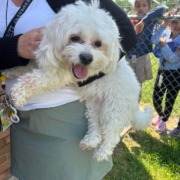 Proof of ownership is required. Small, sweet white dog found at Southport Elementary.