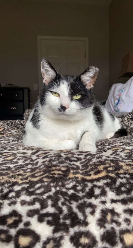 Medium/Large Black and white Male cat. He has a left tipped ear (if you’re looking at him head on , it’s the right ear). He has green/yellow eyes. Has half of a black mustache across his lip!