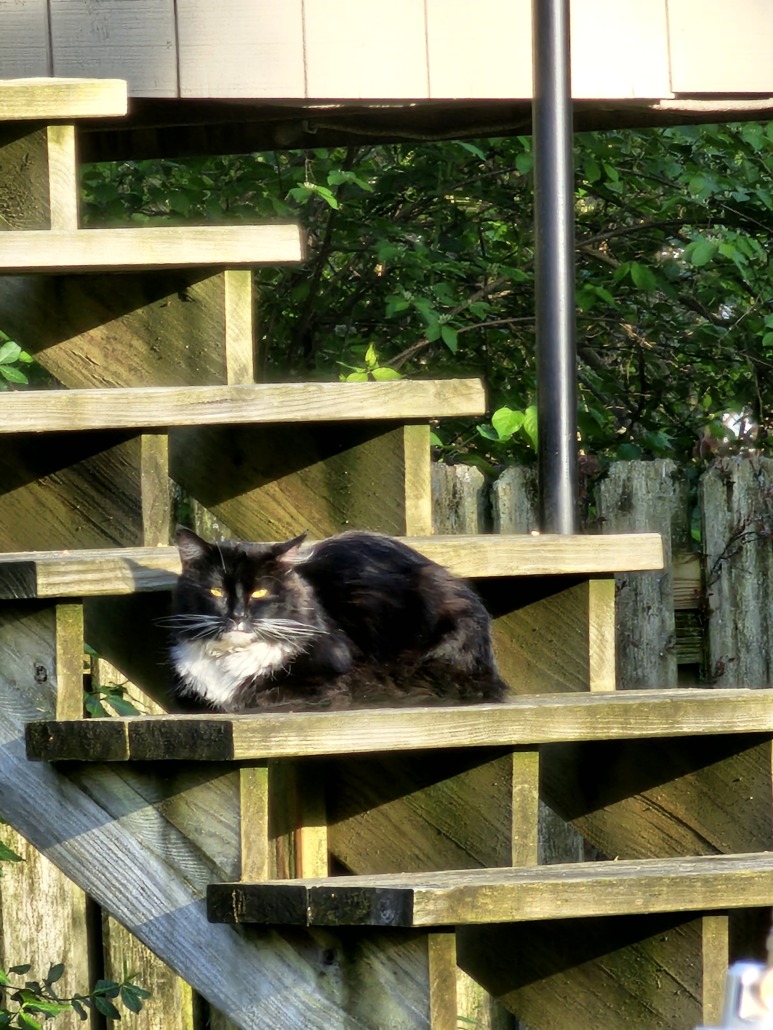Black long hair with white paws & a white chest. Seems sweet but timid.