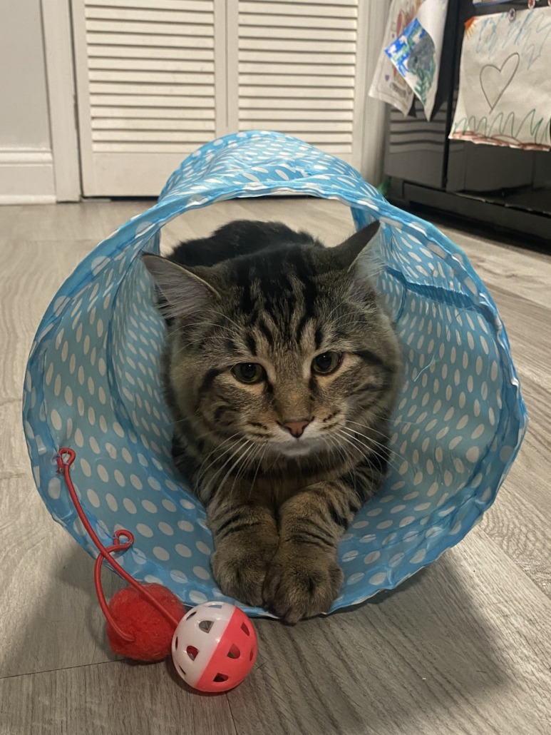 Black and fluffy long tail. Sweet but doesn’t like to be touched. White eye liner eyes