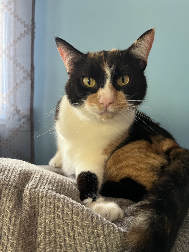 Very shy and sweet cat. She’s scared of new people and loud noises. It’s been thundering and raining today I just want her home safe. Mostly black and orange on her back and on her belly it’s white. Face is black and white her eyes a green.