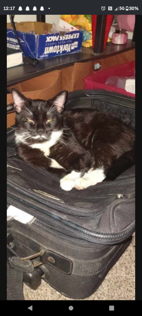 Milky is a tuxedo cat, he is black and white and has a white strip across his upper lip to where it looks like he has a milk mustache….he’s such a a sweet boy.