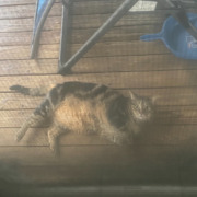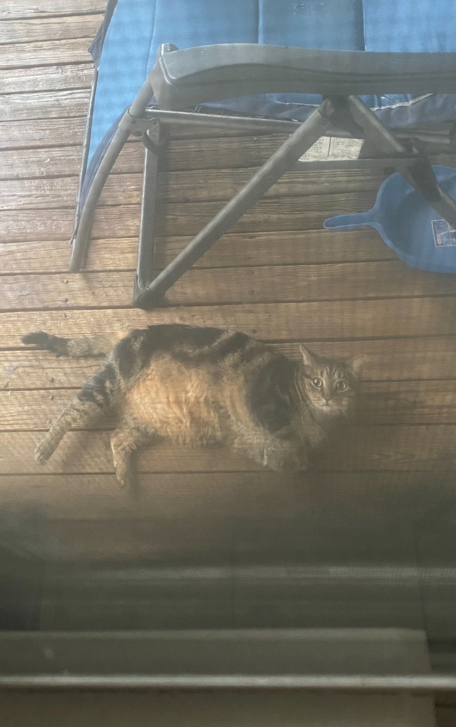 This cat arrived on my daughter’s porch last night. She tried to feed it, it was not interested.