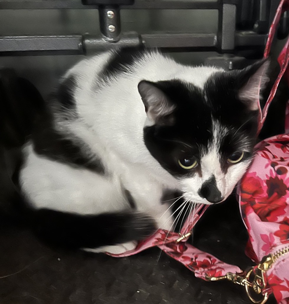 Sweet black and white cat. Definitely not a kitten. No collar or tags. Clean, looks well-cared for. Allowed us to pick her up.