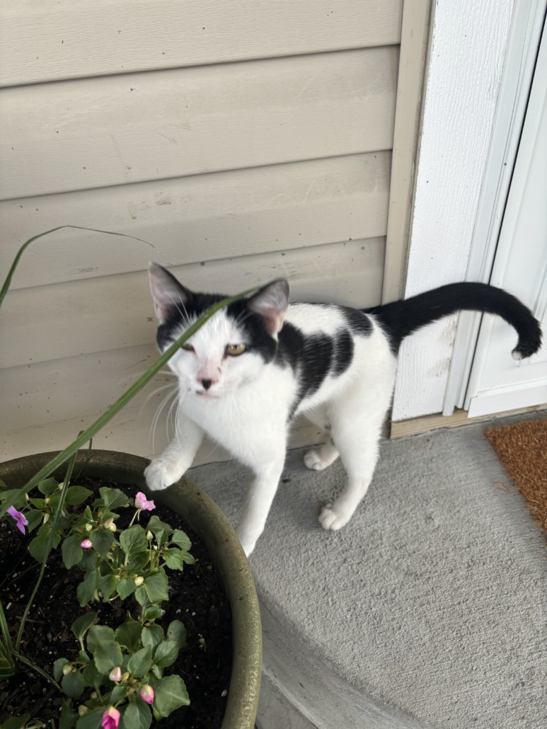 Black and white young cat. Very friendly.