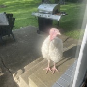 The turkey has been hanging out in our backyard all day. We have put water out for it. When he notices someone home, he comes to the door.