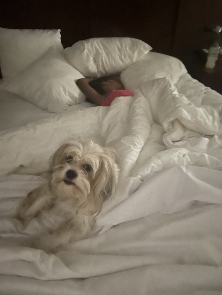 She is mostly white with a brown patch on her back she may have some yellow paint in ther her because her also my other dogs go into some