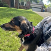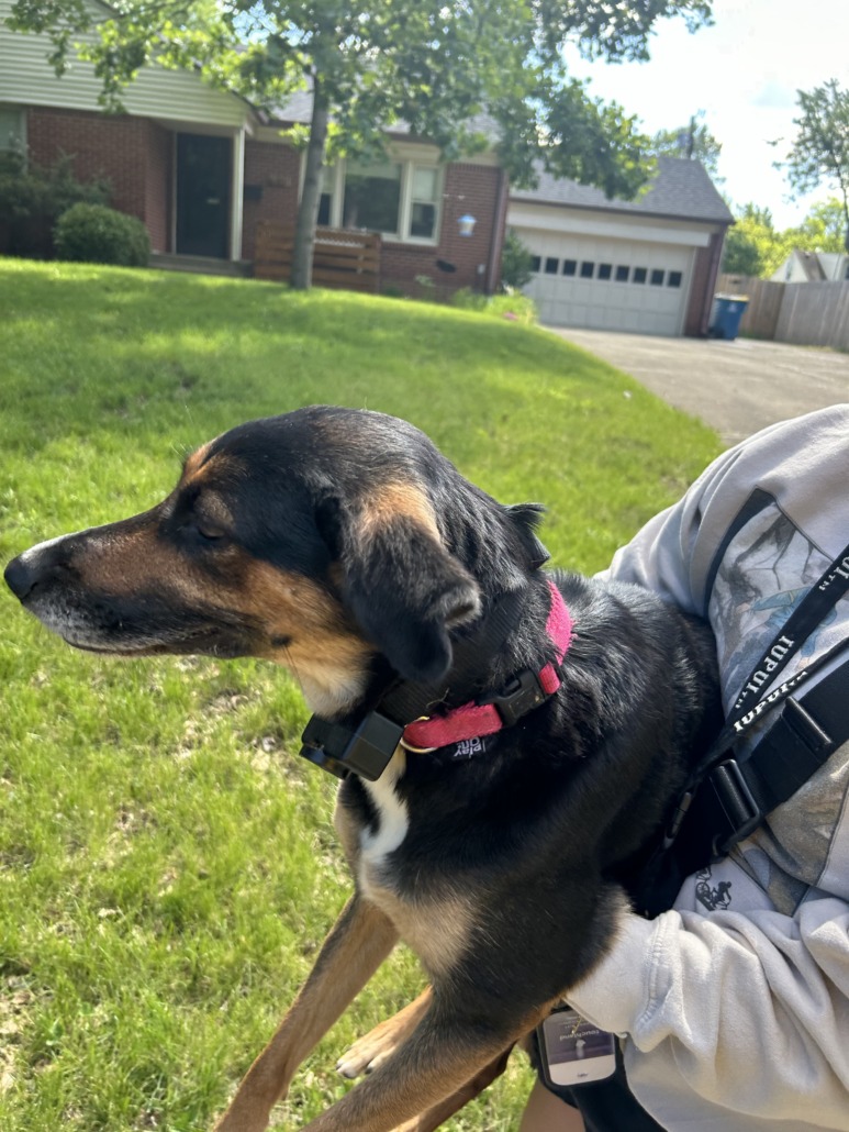 walking along N Burlington when she jumped in front of my boyfriend and i and started crying to us. has two collars but the shock collar seems to be broken
