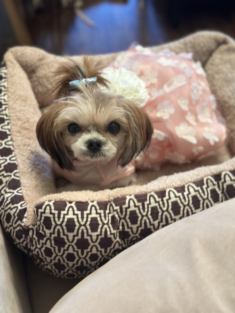 10 lb Lhasa Apso with a green rose on her collar