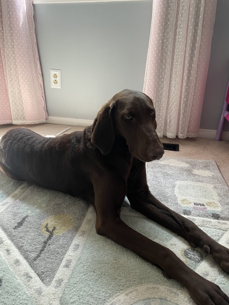 Two year old chocolate lab. Sweet girl and very friendly and has a collar.