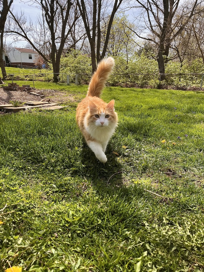 Wilson has fluffy orange and white fur and a scar on his upper lip.
