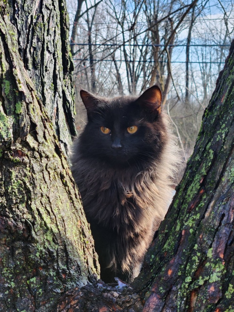Very fluffy solid black has beautiful eyes crackle green and gold look