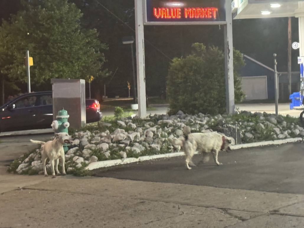 Two dogs—one looked to be a white pit bull and the other a white with black spots, maybe pit mix? The white with black spots had a collar on.