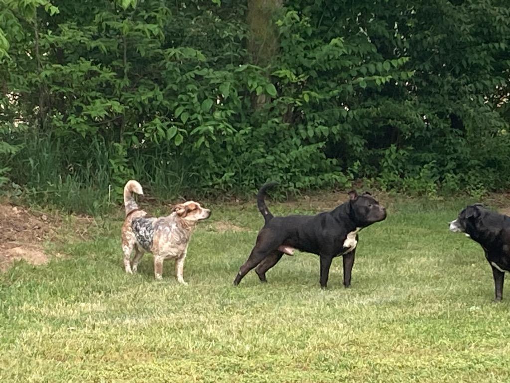 Two dogs. Not chipped. Not starving. Looks to be house dogs. Gets along fine with our two dogs. Warm and friendly.