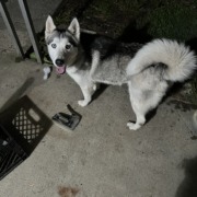 Mostly gray female husky pup, left eye brown, right eye blue, wearing a pink collar with no tag. Does not appear to be spayed. Is not microchipped. Proof of ownership is required.