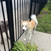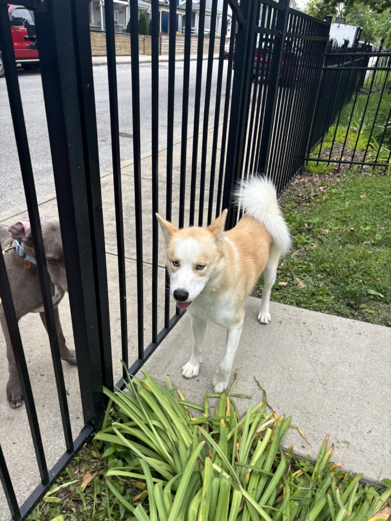 White and tan husky mix. Male. Not neutered. No collar. Proof of ownership required