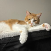 Saba is a 3 year old American shorthair male who is very friendly but will likely not approach strangers. His left side of his snout is white and his right is orange. His belly area and legs are primarily white while his back is orange (turtleshelled). He does not have a collar on currently