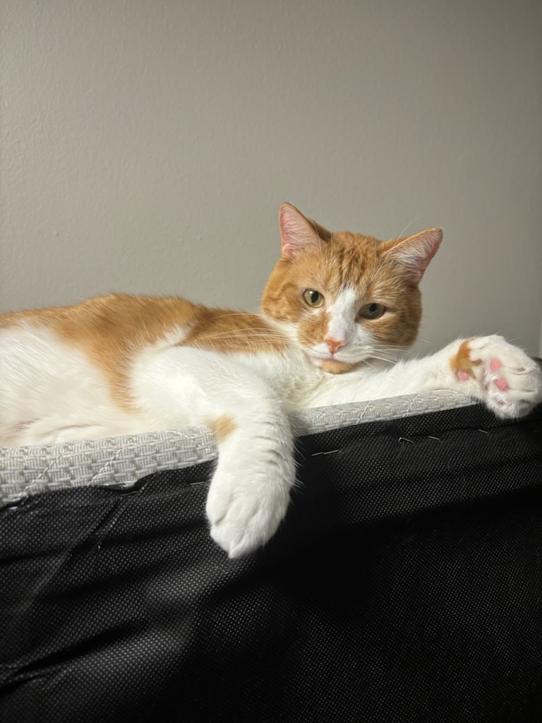 Saba is a 3 year old American shorthair male who is very friendly but will likely not approach strangers. His left side of his snout is white and his right is orange. His belly area and legs are primarily white while his back is orange (turtleshelled). He does not have a collar on currently
