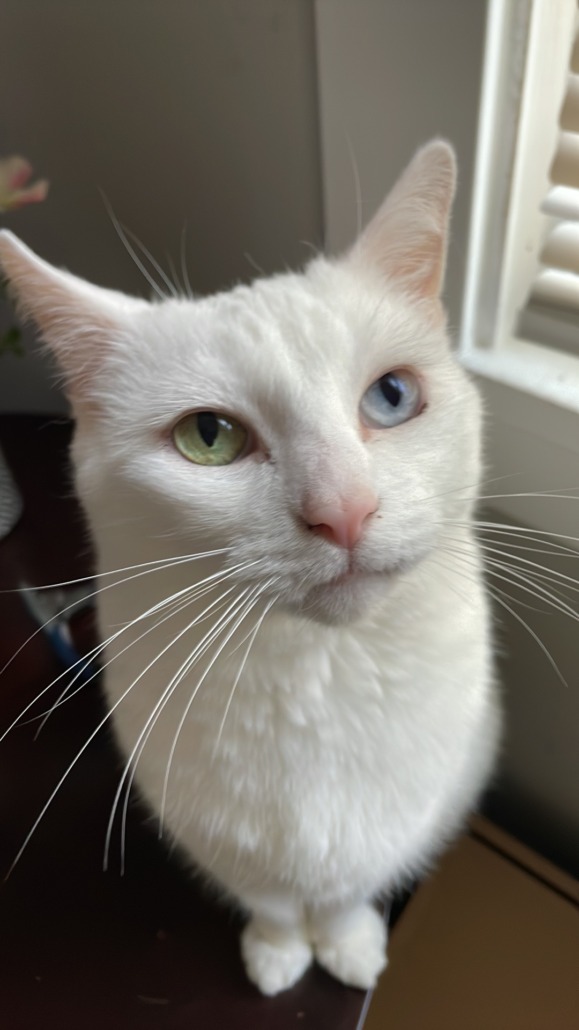 Eve is a solid white cat. She is 10 and has always been a strictly indoor cat. She has a green eye and blue eye. We are not sure if she got out some how or is hiding in the home but has not been seen in 24 hours which is extremely unusual. She’s very social but probably scared if outside.