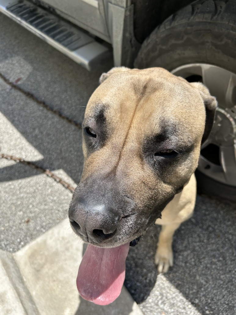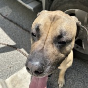 XX-L male tan with black mouth and nose love being brushed and a snuggle-aholic but is a mastiff non aggressive with kids has a very loud and deep bark but rarely barks