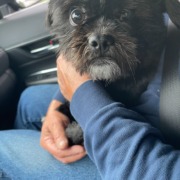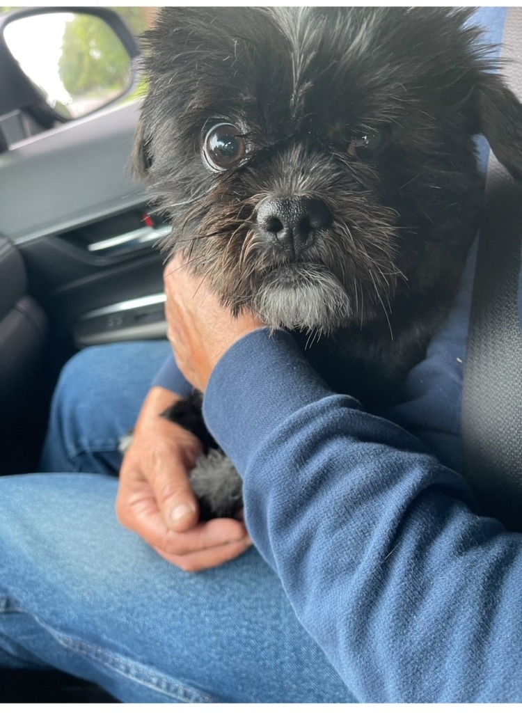 Male Shih Tzu found at intersection of Emerson and New York street. Mostly black with white hair on chin and top of head.