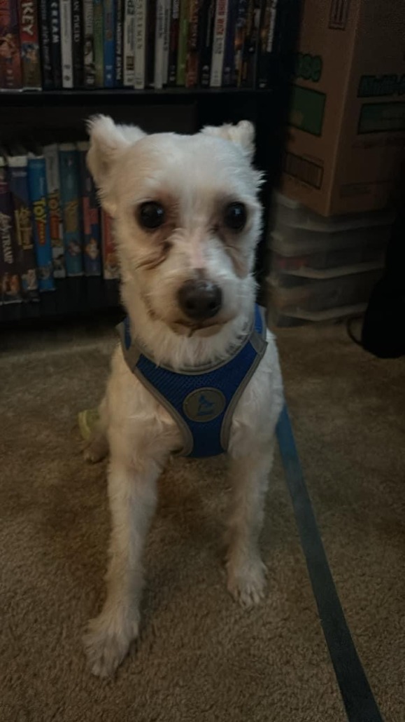 Small white dog groomed short on body with long hair on tail. Tan spots on sides. Found wearing blue harness with leash still attached.