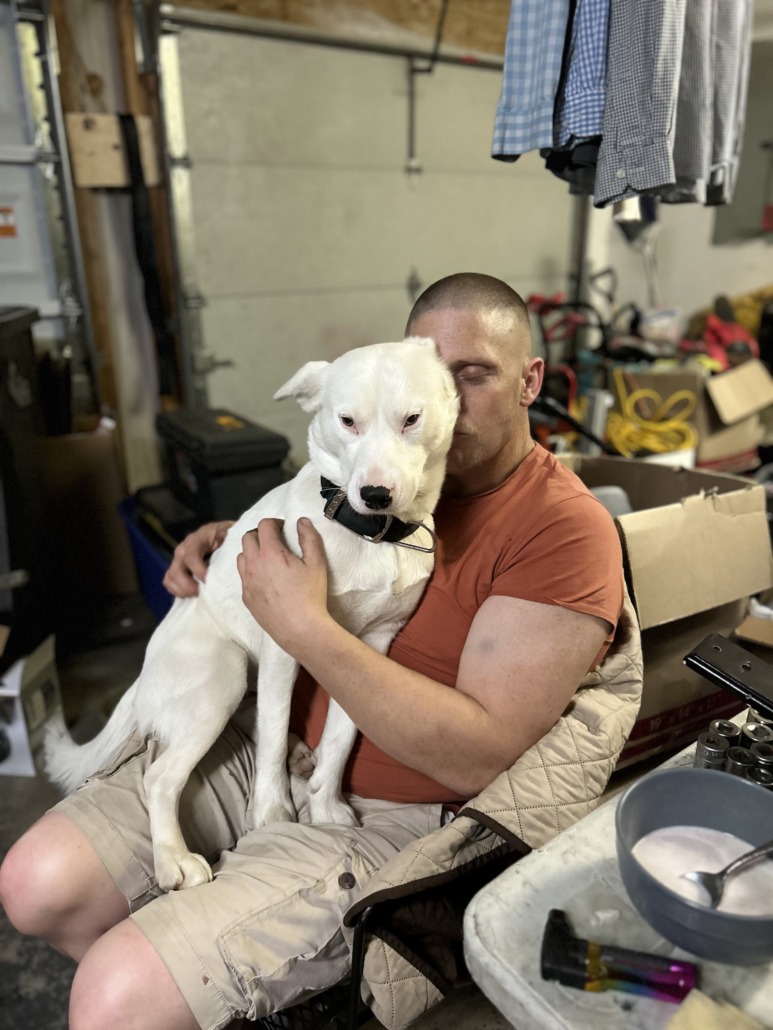 He is an albino/all white Australian shepherd pit mix. He is very very friendly and loves to jump all over any human who seems like they might be willing to pet him. Please please please call me if you see him!