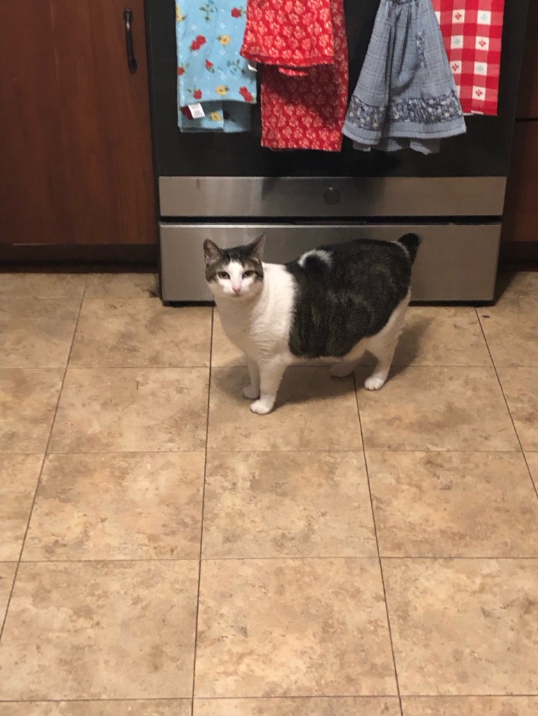 JoJo is a sweet cat about 10 pounds and has all white fur and a brownish gray patch on her back and the top of her head. She has a bobtail that sticks up and kind of wags like a dog’s would but she is a cat. Will come to you for any treats but is scared of loud noises