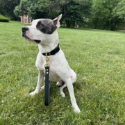 Large white dog with black/grey spot on eye and tail, unaltered male, young, no chip